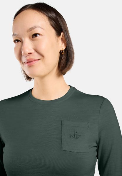 Dank der natürlichen geruchshemmenden Eigenschaften der Merinowolle können Sie das Shirt problemlos mehrere Tage hintereinander tragen, ohne es waschen zu müssen. Dies macht es zum idealen Begleiter für längere Ausflüge in die Natur oder für einen aktiven Alltag. Die dekorative Brusttasche mit einem dezenten Odlo-Schriftzug und einem gestickten Baum verleiht dem Shirt einen stilvollen Akzent und bietet praktischen Stauraum.