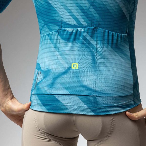 Besonders hervorzuheben sind die aerodynamischen, kurz geschnittenen Ärmel aus hoch elastischen Stoffen der neuesten Generation, die für zusätzlichen Komfort sorgen. Der durchgehende Reißverschluss ermöglicht eine einfache Anpassung der Belüftung während der Fahrt. Drei praktische Rückentaschen bieten ausreichend Platz für Ihre wichtigsten Utensilien, und die Silikonbündchen an der Unterseite verhindern ein Verrutschen des Trikots.