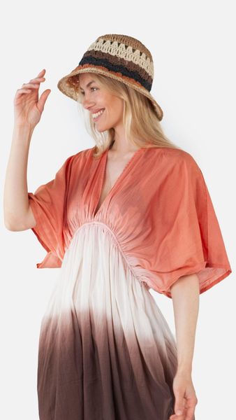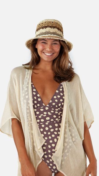 Der Feathery Hat von Barts ist ein stilvoller, handgefertigter Sommerhut, der speziell für Damen entworfen wurde. Dieser runde, gehäkelte Hut besteht zu 100% aus Papier und besticht durch seine farbigen Streifen, die jedem Sommeroutfit eine fröhliche Note verleihen. Die 9 cm breite Krempe bietet nicht nur optimalen Sonnenschutz, sondern verleiht dem Hut auch eine elegante Silhouette.