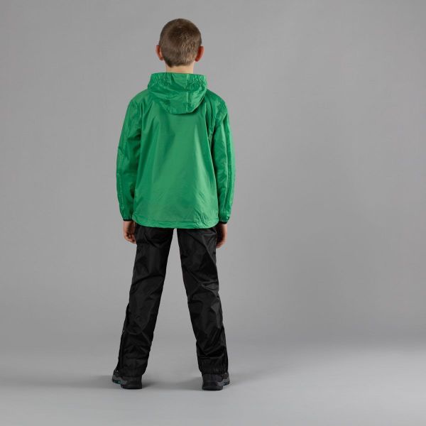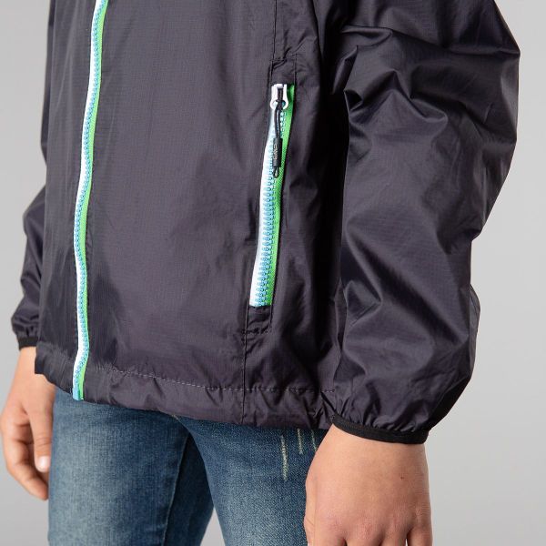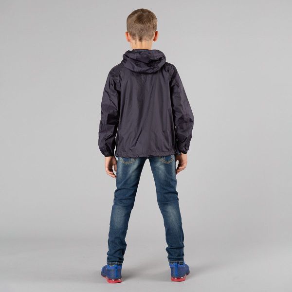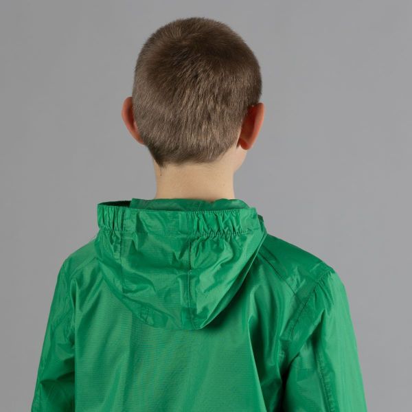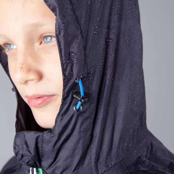 Leichte, wasserdichte Kinderregenjacke mit verschweißten Nähten und praktischer Kompressionstasche für unterwegs.