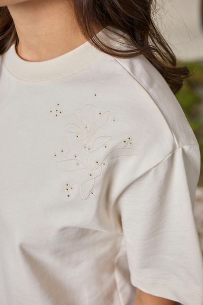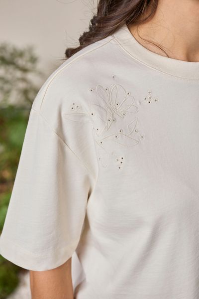Ein besonderes Highlight des Shirts sind die tonalen Lochstickereien auf der Schulter, die eine Blume darstellen. Diese kunstvolle Gestaltung aus einer einzigen durchlaufenden Linie ist inspiriert von Malojas Kollektionsthema LA VIA und setzt einen subtilen, aber wirkungsvollen Akzent.