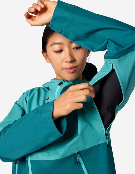 Besonders praktisch ist das durchdachte Design der Jacke: Die zonenoptimierte Materialverteilung erhöht die Strapazierfähigkeit im Brust- und Schulterbereich und verbessert die Atmungsaktivität an den Armen und am Körper. Ein nahtloses Schulterdesign sorgt für mehr Komfort und Bewegungsfreiheit, während die feste, helmtkompatible Kapuze mit äußerer Kordelverstellung zusätzlichen Schutz bietet. Die wasserabweisenden Reißverschlusstaschen sind so konzipiert, dass sie auch beim Tragen eines Gurts oder Rucksacks leicht zugänglich sind.