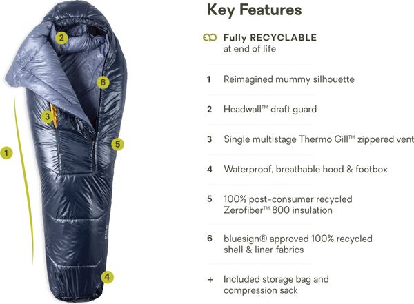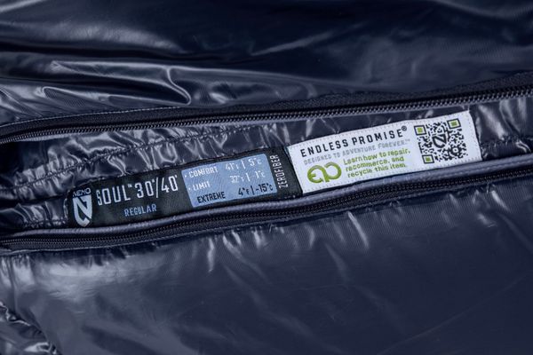 Besonders hervorzuheben ist die umweltfreundliche Herstellung des Schlafsacks. Das Zerofiber™ 800 Material, eine ultraleichte und wasserabweisende synthetische Füllung, besteht aus recyceltem Material. Zudem ist der Soul Schlafsack so konzipiert, dass er am Ende seiner Lebensdauer vollständig recycelbar ist, um Müll zu vermeiden. Senden Sie ihn einfach an NEMO zurück, die sich um den Rest kümmern. Die robuste Konstruktion mit verstärkten Kapuzen- und Fußteilen schützt vor Feuchtigkeit und Kondenswasser.