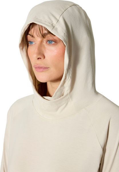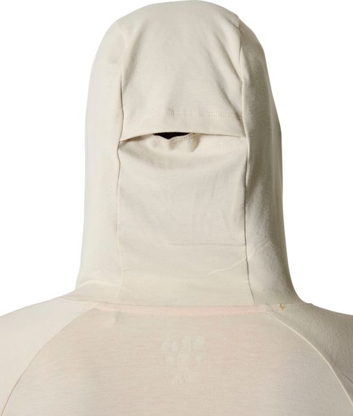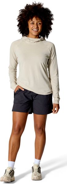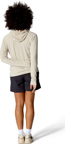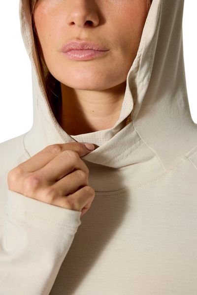 Besonders hervorzuheben sind die Netzeinsätze unter den Armen, die für eine optimale Luftzirkulation sorgen, sowie die praktischen Daumenschlaufen, die ein Verrutschen der Ärmel beim Bouldern verhindern. Der Rivelin Hoody ist mit einer weichen, eng anliegenden Kapuze ausgestattet, die ein einzigartiges Netzdetail und einen bequemen Wickelkragen bietet. Ein besonderes Feature ist die Öffnung an der Kapuze, die das Tragen eines Pferdeschwanzes ermöglicht, ohne den Komfort zu beeinträchtigen.
